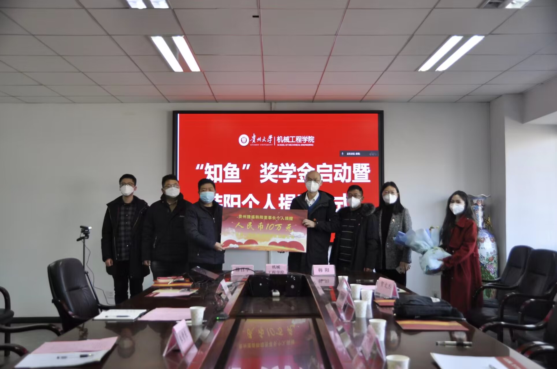 20221221日上午10時,貴州大學(xué)機(jī)械工程學(xué)院聯(lián)合貴州捷盛鉆具股份有限公司在518會議室舉辦了“知魚”獎學(xué)金啟動暨韓陽個人捐贈儀式。院黨委書記滕召華、院長趙津、副院長何峰、科研與對外合作辦主要負(fù)責(zé)人、各專業(yè)系室中心主任,學(xué)生代表出席了本次捐贈儀式。