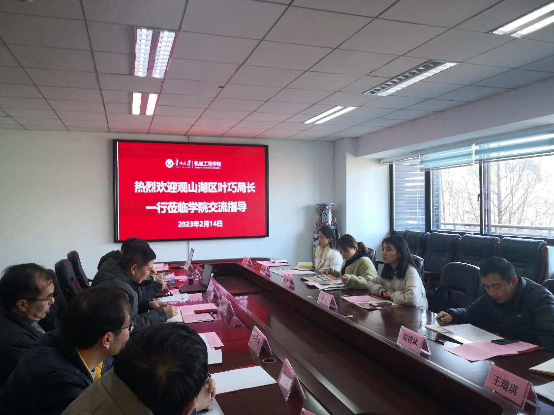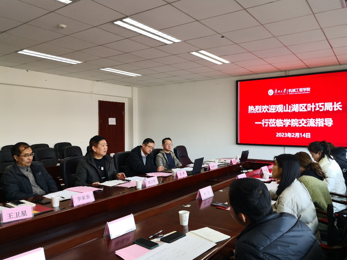 2023年2月14日下午,貴州大學(xué)機(jī)械工程學(xué)院與貴陽市觀山湖區(qū)科學(xué)技術(shù)局、觀山湖區(qū)工業(yè)和信息化局、觀山湖區(qū)人力資源和社會(huì)保障局在機(jī)械樓518會(huì)議室舉行合作交流會(huì)議。觀山湖區(qū)科學(xué)技術(shù)局黨組書記、局長葉巧,觀山湖區(qū)工業(yè)和信息化局企業(yè)管理服務(wù)科陸植林科長,觀山湖區(qū)人力資源和社會(huì)保障局就業(yè)服務(wù)科李昕科長等出席了會(huì)議。機(jī)械工程學(xué)院黨委書記滕召華、機(jī)械工程學(xué)院趙津院長、李家春副院長,以及各系室主任和青年教師代表參加了會(huì)議。