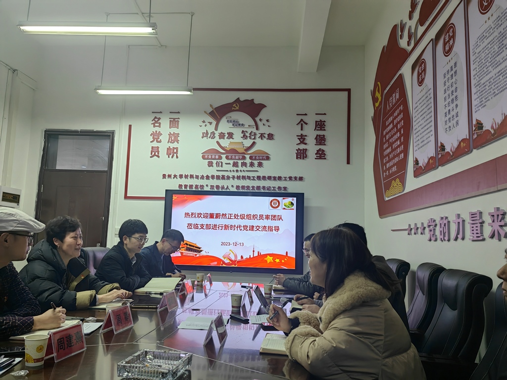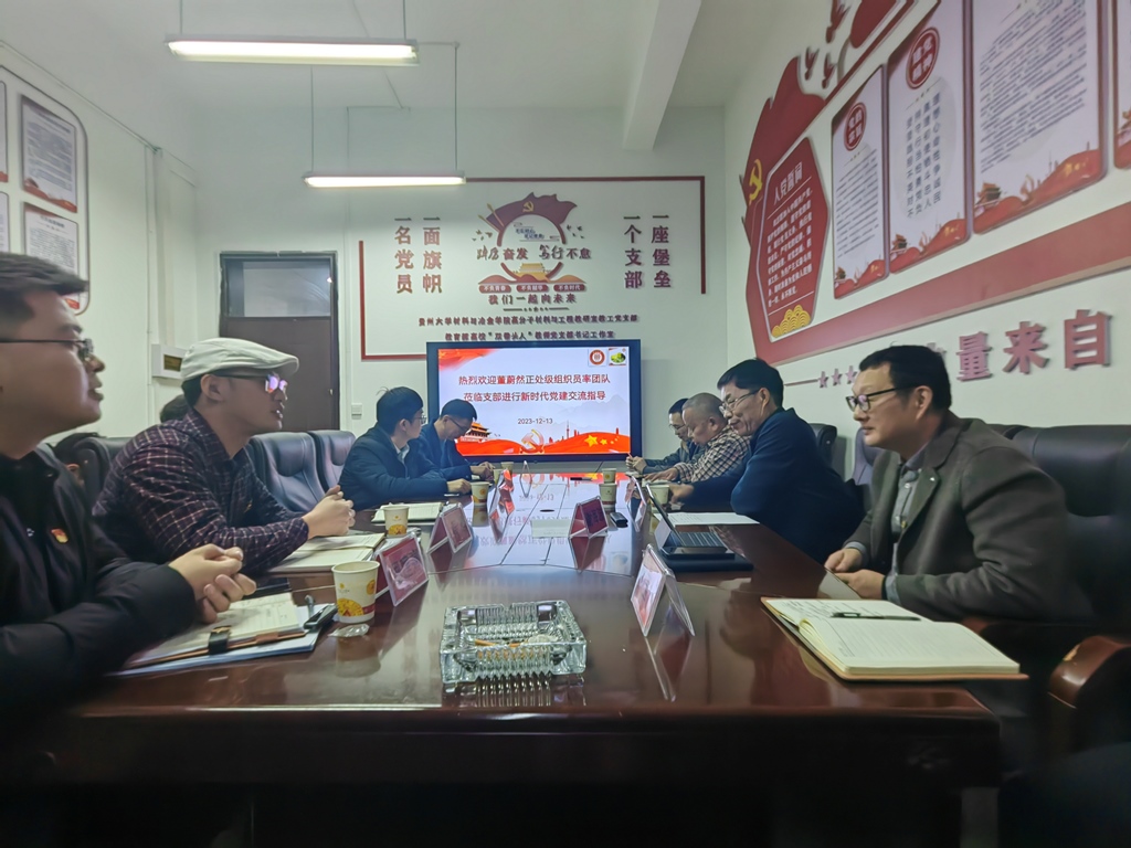 12月13日,貴州大學(xué)黨委正處級(jí)組織員董蔚然攜我支部支委成員與材料與冶金學(xué)院高分子材料與工程教研室教工黨支部開(kāi)展黨建交流。材料與冶金學(xué)院黨委書(shū)記劉劍、正處級(jí)組織員熊玉竹以及高分子材料與工程教研室教工黨支部全體黨員參加活動(dòng)?;顒?dòng)由全國(guó)高?!半p帶頭人”教師黨支部書(shū)記工作室負(fù)責(zé)人、高分子材料與工程教研室教工黨支部書(shū)記謝海波主持。