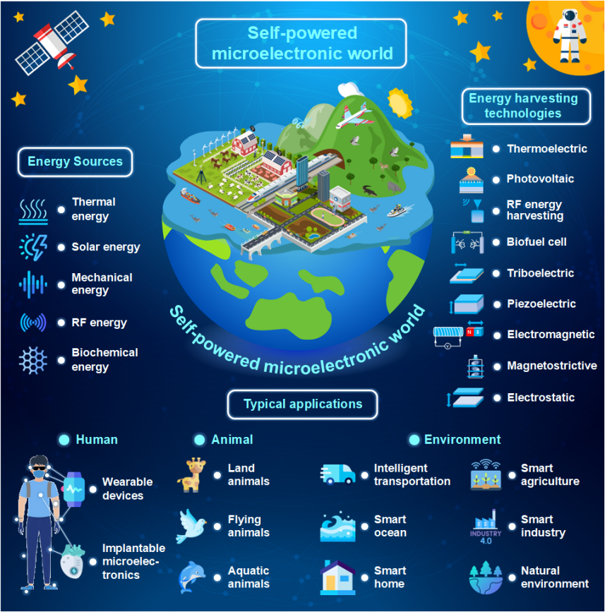 人工智能和物聯(lián)網(wǎng)正在推動基于自供電技術(shù)的微電子器件的快速發(fā)展,深刻影響著世界的發(fā)展進程。本文全面回顧了自供電微電子領(lǐng)域的最新進展、挑戰(zhàn)和未來發(fā)展方向。綜述了人體可穿戴設(shè)備、動物可穿戴設(shè)備和環(huán)境監(jiān)測傳感器的總體研究進展。此外,本文還詳細概述了可用于自供電微電子的環(huán)境微能源類別,以及能量收集技術(shù)的原理和特征。從應(yīng)用角度出發(fā),全面總結(jié)了自供電微電子技術(shù)在人體可穿戴設(shè)備(眼鏡、助聽器、口罩、背包、手表、腕帶、手套、外骨骼系統(tǒng)、鞋襪)、動物可穿戴設(shè)備(陸地、飛行、水生)、環(huán)境監(jiān)測傳感(智能交通、智能海洋、智能家居、智能農(nóng)業(yè)、智能工業(yè)、以及自然環(huán)境監(jiān)測)。最后,針對自供電微電子器件的不足,提出了該領(lǐng)域的研究空白和未來的研究方向。