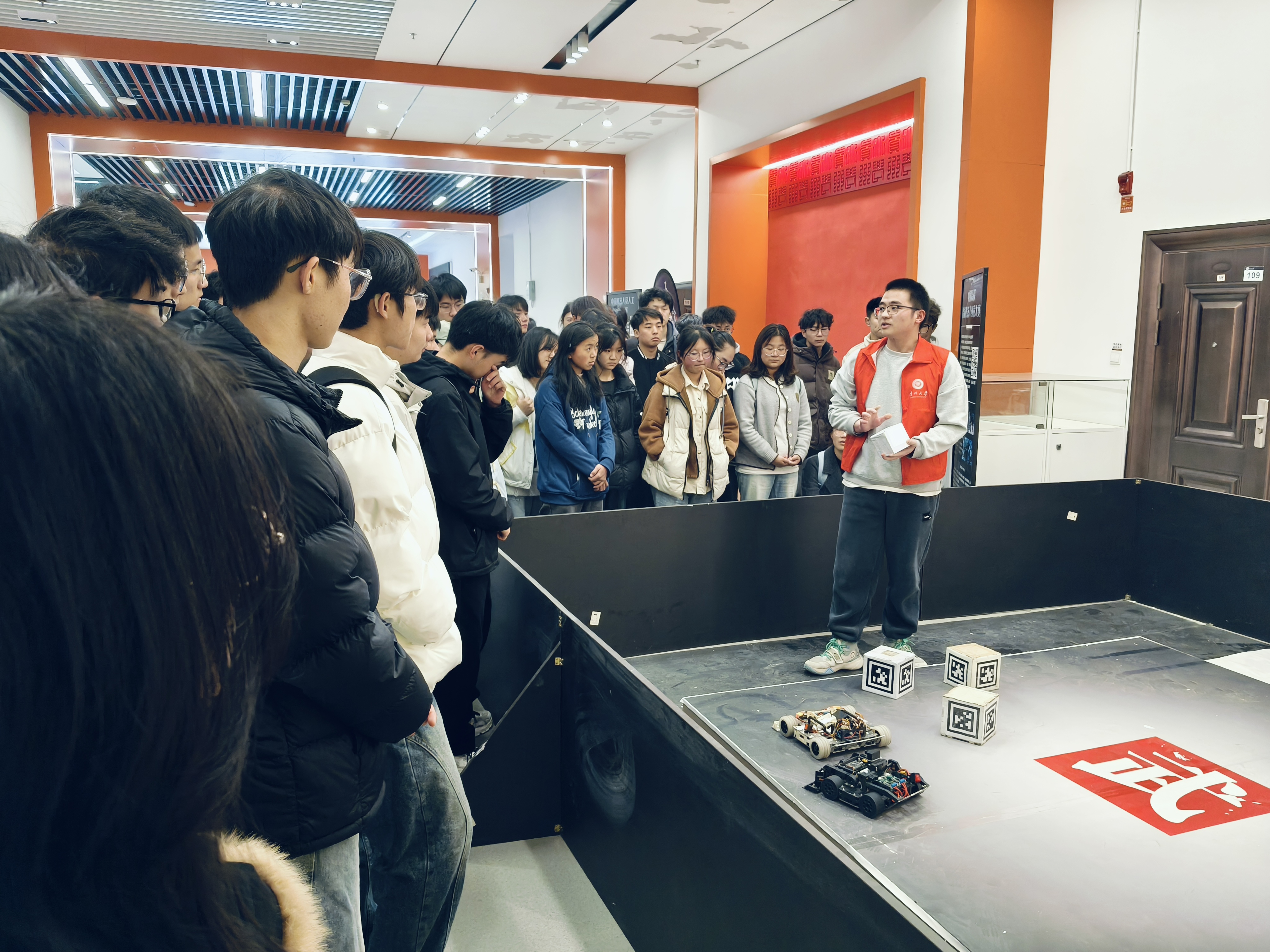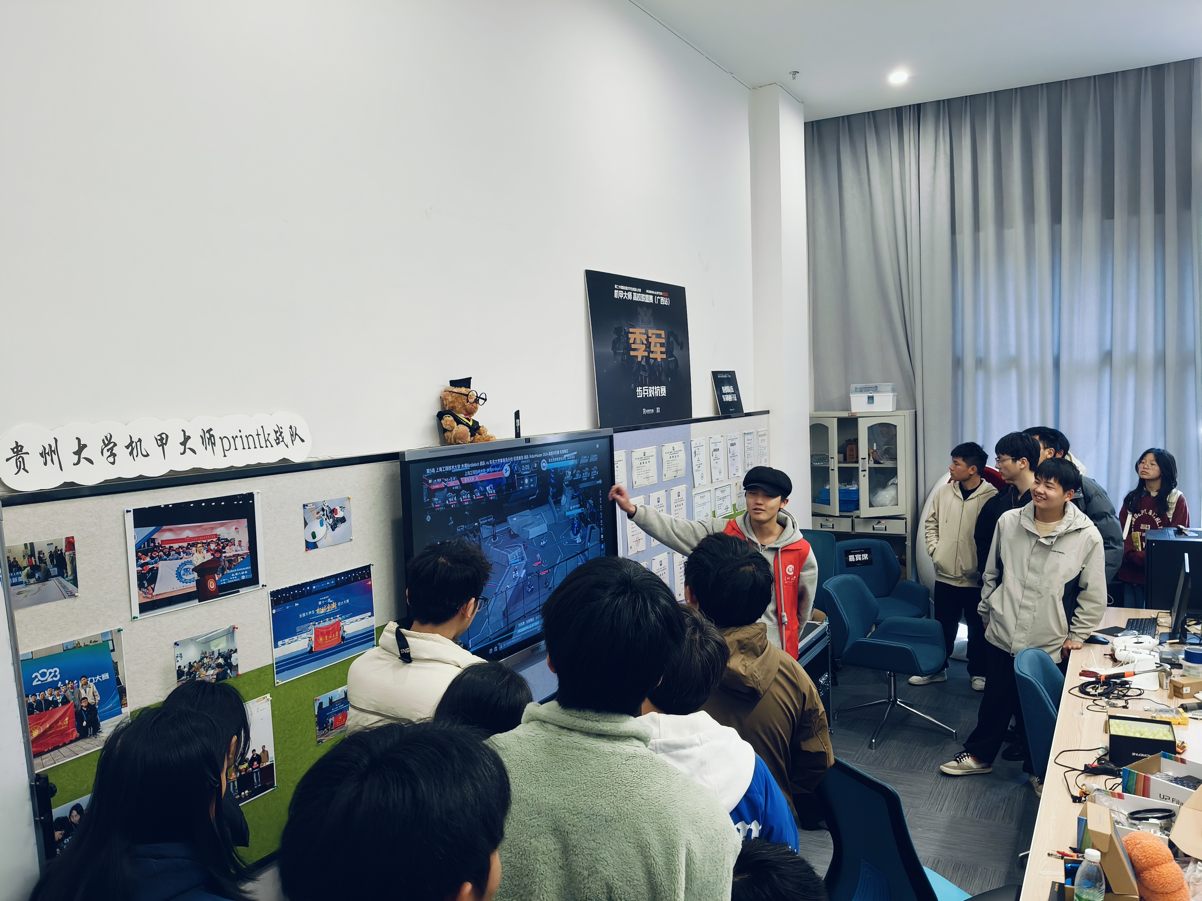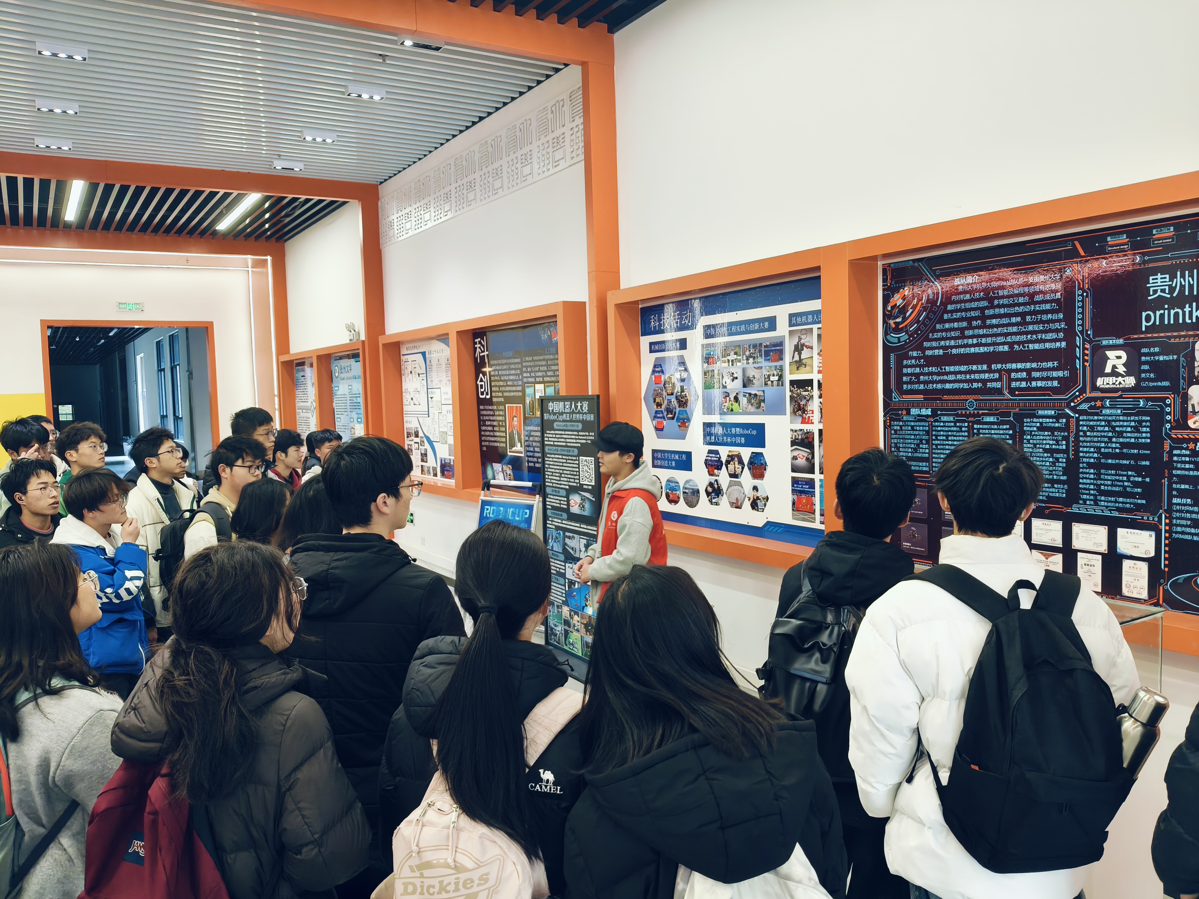 正式介紹優(yōu)秀作品前,馭想俱樂部負責人楊春白雪向同學們介紹習近平總書記給中國國際大學生創(chuàng)新大賽參賽學生代表回信內(nèi)容。隨后楊春白雪和機器人社團負責人田景怡分別對兩個科創(chuàng)社團進行了介紹并對相關(guān)賽事進行解讀,還向大家展示了貴州大學代表隊的獲獎作品。在參觀robomaster工作室時,獎杯墻令人震撼。同學們表示一個個獎杯背后的故事更令人欽佩,激勵機械青年守正創(chuàng)新,再創(chuàng)佳績。