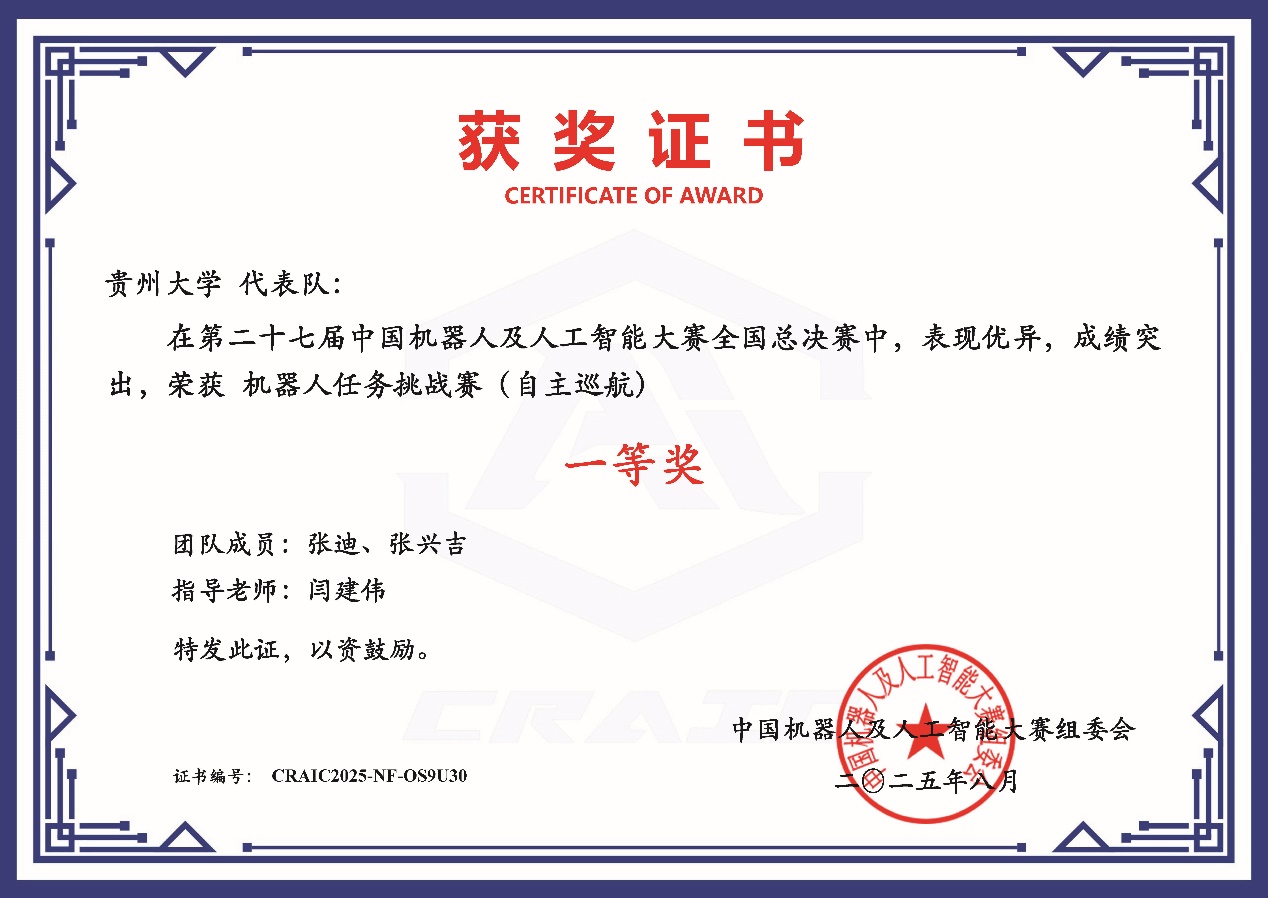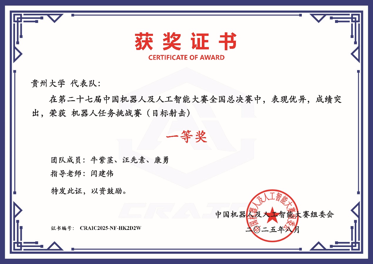 機械工程學(xué)院各參賽隊伍成員和指導(dǎo)老師經(jīng)歷了長達(dá)半年多的辛苦備賽,經(jīng)過校、省、全國總決賽層層選拔和激烈角逐最終在2025年8月3日到8月22日舉行的第27屆CRAIC中國機器人及人工智能大賽全國總決賽中取得國賽一等獎3項、國賽二等獎8項、國賽三等獎3項,再創(chuàng)貴州大學(xué)參加該比賽國賽一等獎數(shù)量和獲獎總數(shù)的歷史新高。值得一提的是微型無人機賽道今年是首次參賽,由管彥銀擔(dān)任隊長的貴州大學(xué)小芯藝藝代表隊奪得貴州大學(xué)在此賽道中的首個國賽一等獎的好成績。