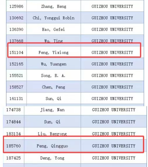 2025年9月19日,美國斯坦福大學(Stanford University)與愛思唯爾(Elsevier)聯(lián)合發(fā)布了第八版《全球前2%頂尖科學家榜單2025》(World’s Top 2% Scientists 2025)。該榜單依托Scopus數(shù)據(jù)庫的引用數(shù)據(jù)進行系統(tǒng)分析,從全球近700萬名科學家中,依據(jù)“生涯影響力”和“年度影響力”兩項指標,遴選出世界排名前2%的頂尖科學家。其中,中國有12374位學者入選“終身榜”,31685位學者入選 “2025 年度榜”。我院馮毅雄教授、彭慶國副教授亦榜上有名,成功入選2025年全球前2%頂尖科學家“年度影響力”榜單,如圖1所示。